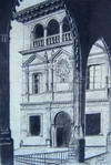 Dos imágenes de la plaza, la de carboncillo de 1935, y la de color de 1944. |
