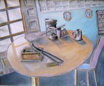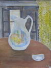 Tras 2 años de parón creativo, de vuelta en este año con dos cuadros. El primero de ellos es un acrílico de un bodegón en el que reúne su habilidad para elegir los colores junto con su inconfundible mano para jugar con la perspectiva.
